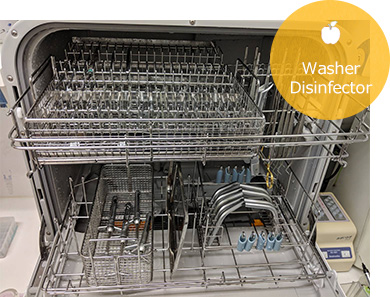 - 当院では患者さまお一人毎に使用しております、ミラーやピンセットなどの器具を自動ジェット式器具洗浄器にて、洗浄から消毒、乾燥を行っております。