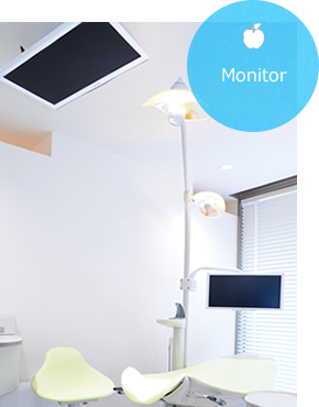 - フルフラットの診療台ですので、横になったまま見られるモニターを天井に設置しています。